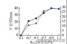 圖 1 上為不同 K12A 濃度條件下的發(fā)泡劑半衰期及發(fā)泡倍數(shù)的變化規(guī)律。試驗(yàn)結(jié)果顯示:隨著K12A 濃度的增大, 發(fā)泡劑的發(fā)泡倍數(shù)相應(yīng)提高。在0% ~ 0.7% 濃度范圍內(nèi)增長比較明顯;在0.7% ~0.9%范圍內(nèi)增速減緩, 僅增長11 .5%;當(dāng)濃度超過0.9%時(shí)發(fā)泡倍數(shù)不再上升, 此時(shí)達(dá)到臨界濃度;濃度繼續(xù)增大, 發(fā)泡倍數(shù)變化不大。分析其原因?yàn)椋弘S著溶液濃度的增大, 溶液中活性分子數(shù)量增加, 溶液表面張力降低, 發(fā)泡倍數(shù)隨之提高, 但達(dá)到臨界濃度后,氣液界面的表面吸附達(dá)到飽和, 溶液表面張力不再下降, 發(fā)泡能力反而有所降低。