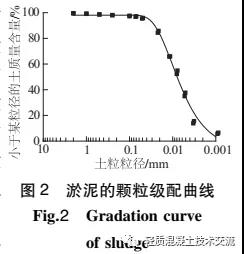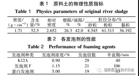 試驗(yàn)所用原料土為蘇州某河道淤泥質(zhì)土, 先過4.75 mm的網(wǎng)篩, 去除淤泥中的雜質(zhì), 通過室內(nèi)土工試驗(yàn), 得到原料土的基本物理指標(biāo)如表 1 所示;所選用的發(fā)泡劑有 K12A, 復(fù)配發(fā)泡劑 F、市售某動物蛋白型發(fā)泡劑, 經(jīng)測試各發(fā)泡劑的理想性能如表 2 所示;原料土的顆粒級配曲線如圖 2 所示, 水采用普通自來水, 固化劑為PO42.5普通硅酸鹽水泥。