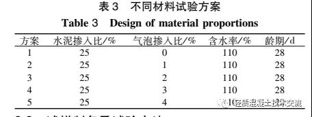 試驗(yàn)中各組成材料的配比以干土質(zhì)量為標(biāo)準(zhǔn), 氣泡摻入比為氣泡質(zhì)量與干土質(zhì)量的比值, 水泥摻入比為水泥質(zhì)量與干土質(zhì)量的比值, 含水率指摻入水之后包含原料土中的水的質(zhì)量與試樣干土質(zhì)量的比值。試驗(yàn)重點(diǎn)考察不同類型的發(fā)泡劑對河道淤泥氣泡混合土物理力學(xué)性質(zhì)的影響, 試驗(yàn)配合方案如表 3 所示。
