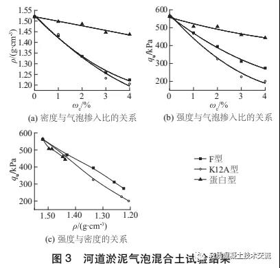 圖 3( c) 為上述 3 種輕質(zhì)土密度與強(qiáng)度的關(guān)系。同等密度下, F 型強(qiáng)度高, K12A 型次之, 蛋白型最差。三者強(qiáng)度差異在不同的密度階段表現(xiàn)不同:當(dāng)密度>1 .45g /cm3時(shí), 差異較小, 原因可能為此階段摻