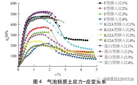 圖 4 為幾種不同配比條件下的應(yīng)力- 應(yīng)變關(guān)系。結(jié)果顯示:氣泡摻入比為 1 %時(shí), 不同發(fā)泡劑對輕質(zhì)土應(yīng)力-應(yīng)變曲線影響不明顯;隨著氣泡摻入