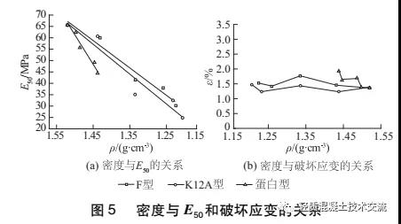 相關(guān) 性, F 型、 K12A 型、 蛋 白 型 擬 合 度 分 別 為0.951 93, 0.907 66, 0.950 37, E50隨密度降低而線性降低;同時(shí), 在同等密度下, F 型輕質(zhì)土的 E50最大,蛋白型最小。通過圖 5( b) 可以看出:破壞應(yīng)變受密度的影響不大, 但總體可以看出, F 型輕質(zhì)土破壞應(yīng)變在1 .4% ~ 1 .8%之間, K12A 型在1 .2% ~ 1.5%之間,蛋白型在1 .3% ~ 1 .9% 之間;同等密度之下, F 型較