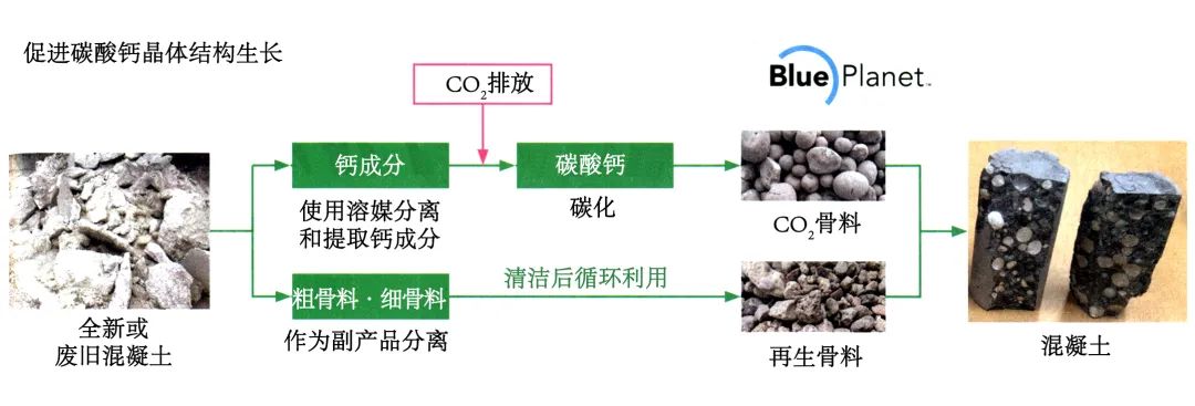 Blue Planet Systems 的碳捕獲工廠利用上述反應過程制成粗骨料和細骨料,其強度與標準骨料相當,是制造碳中和甚至碳吸收混凝土的有效方法。這種骨料表面由合成石灰石CaCO?聚合覆蓋而成,每噸可以捕獲CO?超過440kg。