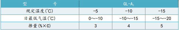 GL-A3泵送防凍劑推薦摻量為 3.0~5.0%·C(占膠凝材料總重),依據現場試驗確 定最佳摻量,可參考下表;